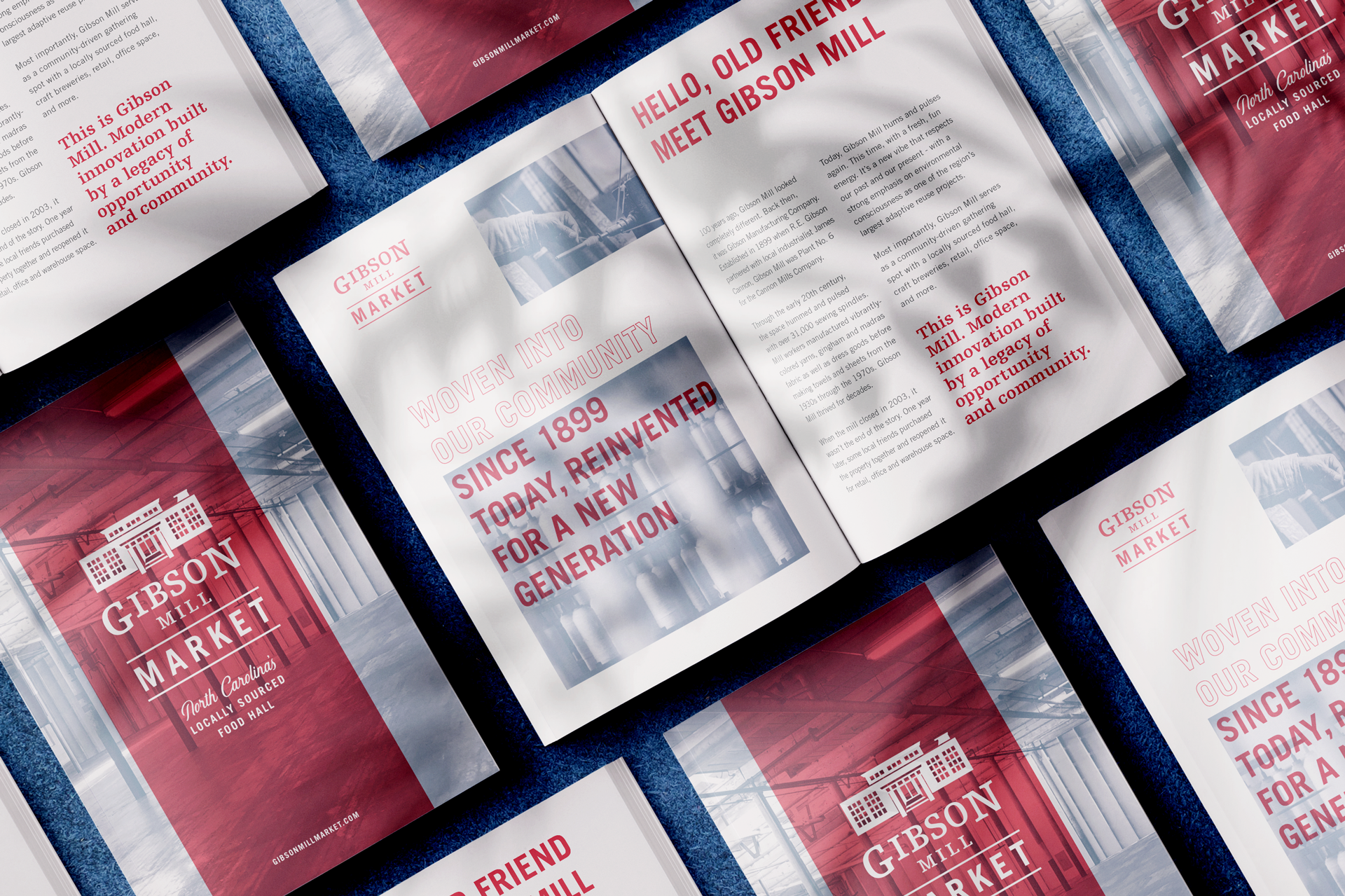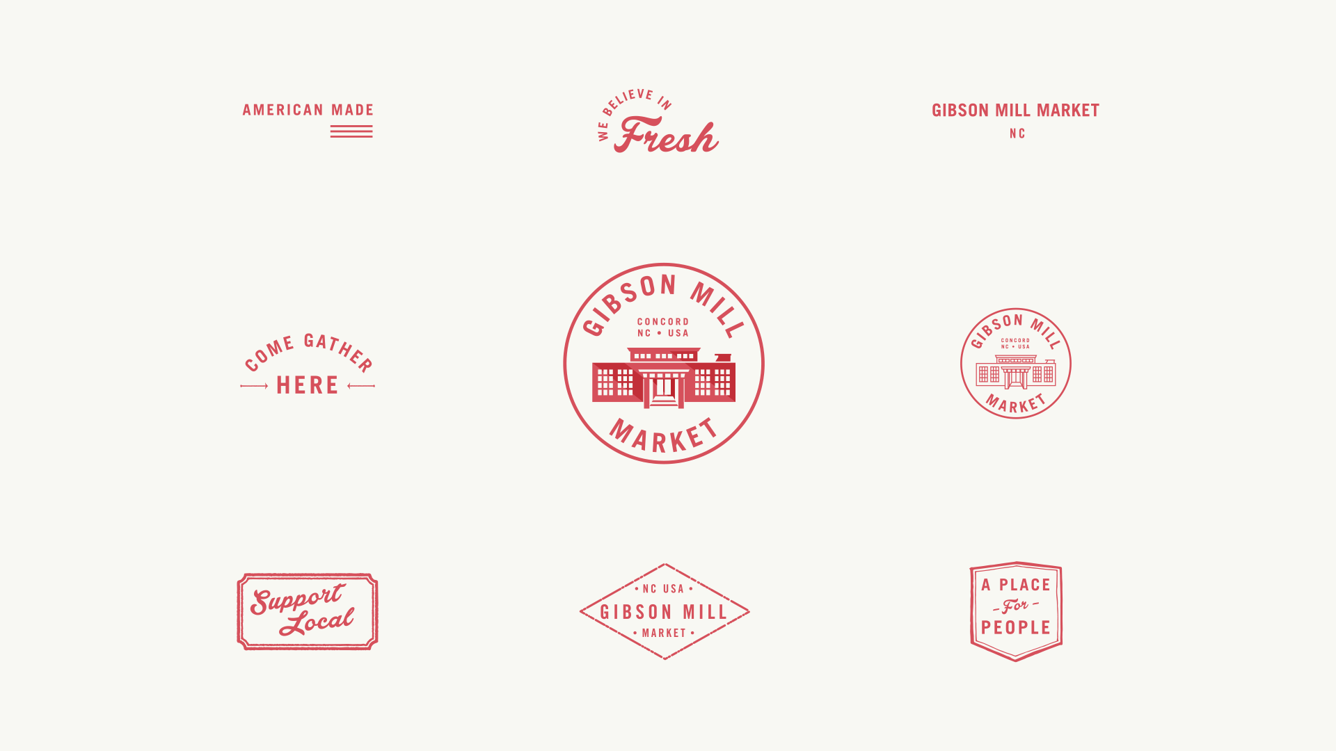 The final Gibson Mill Market brand logo reiterates the overall theme of sustainable placemaking by including an illustration of the historic weaving room building with the clerestory on it’s own that will house the new food hall and market. By combining the Gibson Mill logotype with the bold sans serif typeface for the word “Market”, which is based on type you’d find in old 19th century mill manuals, ties the two brands to work in sync with one another. In addition to the soft red portraying the brick shown throughout the property, it’s also an energizing color that encourages appetite, excitement, warmth and strength. The graphic elements, friendly statements and handrawn illustrations help to visually tell the story of what one can expect from visiting the Market.